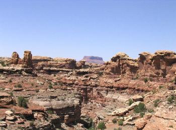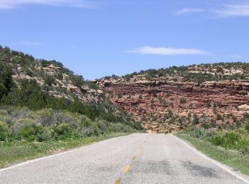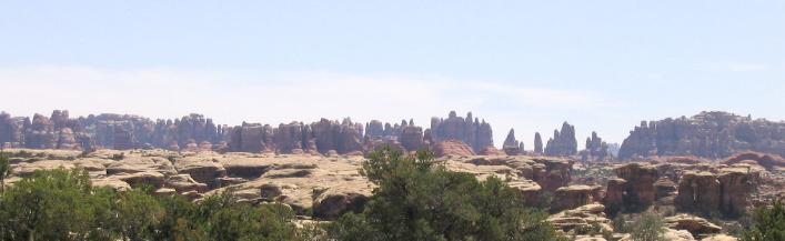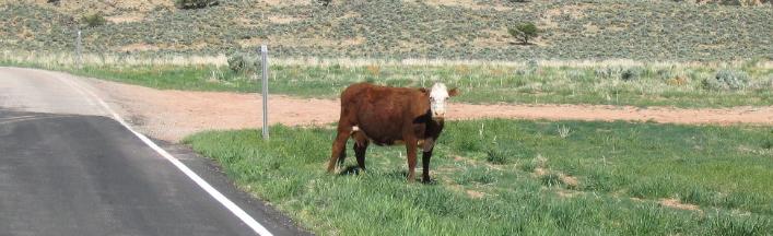 Left to Right, Top to Bottom: (1) These huge rock formations, including cliffs, crevices, arches, spires, and gorges with alternating strata of beige and red clay were formed over millions of years. Initially, oceans covered this region, then the Rocky Mountains surged up and broke the surface of the water. The ocean first deposited a layer of salt then one of limestone. When the ocean receded, altering layers of red clay eroding from the Rockies and sand blowing in from the west formed a multi-layer plateau. As the rivers, wind, rain and snow eroded these lands, with the aid of the unstable layer of salt underneath, over millions of years these unusual rock formations and gorges were formed, (2) once in the park proper, I drove in as far as I could where I got out and walked about a quarter mile to “Big Spring Canyon Overlook” - here is a very scenic spot overlooking a gorge with the multi- layers of strata and unusual rock formations on either side, (3) a view of the famous “Needles” formation in the distance - they look like sentinels of varying heights lined up in a single line, shoulder to shoulder, and (4) mooo.