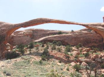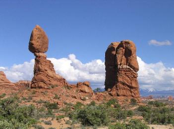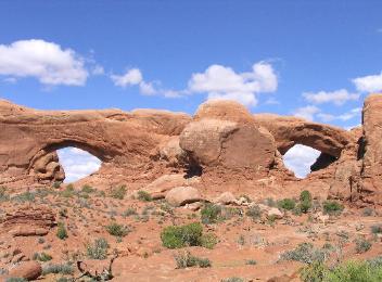 Left to Right: Arches “boasts the greatest density of natural arches in the world” (> 2,000 cataloged). (1) I parked at Devil’s Garden Trailhead and walked to Landscape Arch. This is one of the largest arches in the world, (2) a cactus flower, (3) Fiery Furnace Viewpoint was exceptionally beautiful with its brightly lit, multi-colored rock formations on one side and snow capped mountains in the distance on the other. (4) The North and South Windows from a distance look like a pair of eyes staring at you – eerie. Arches is relatively compact, yet unusual and very beautiful.